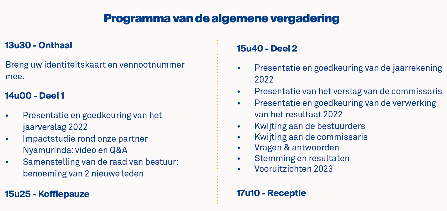 We kijken ernaar uit om de resultaten van onze impactstudie rond deze partner tijdens de algemene vergadering te delen via een video en een Q&A-ronde.